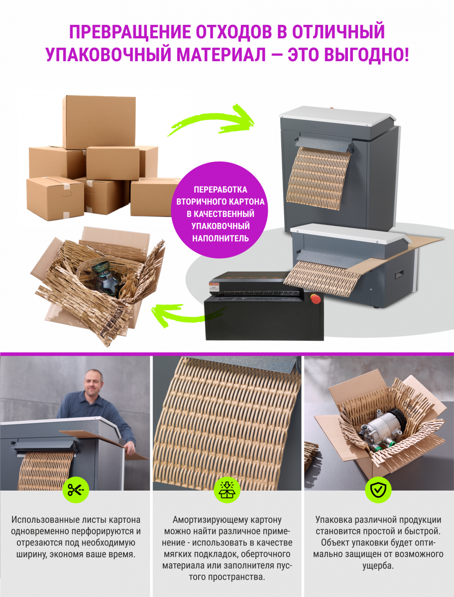 На выходе вы получаете готовый упаковочный материал из старого сырья,